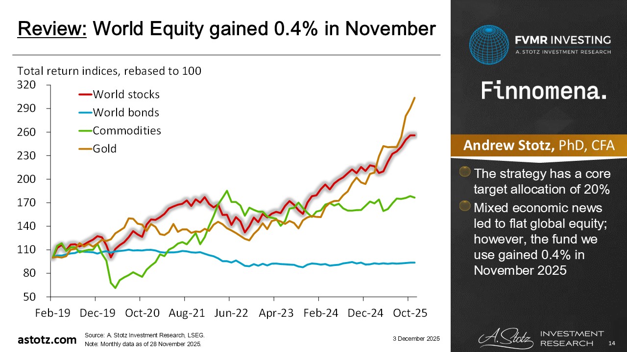 • Mixed economic news led to flat global equity; however, the fund we use gained 0.4% in November 2025