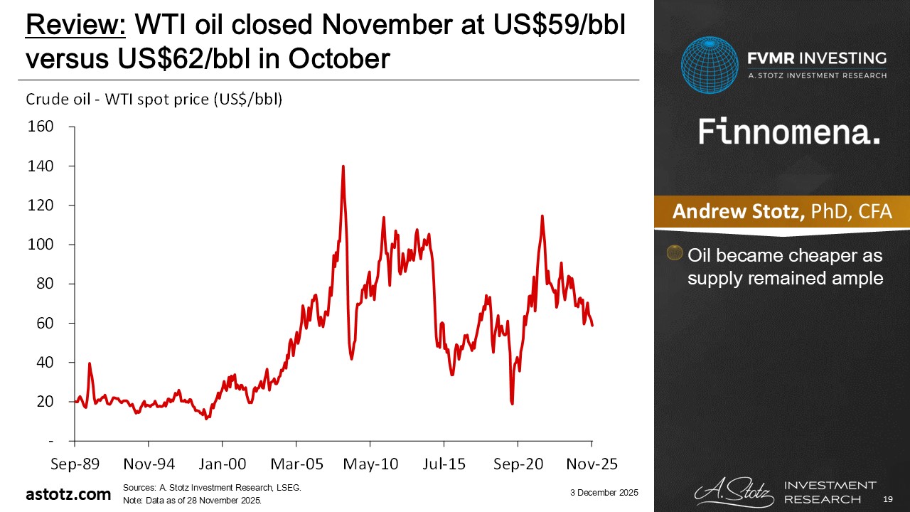 WTI oil closed November at US$59/bbl versus US$62/bbl in October